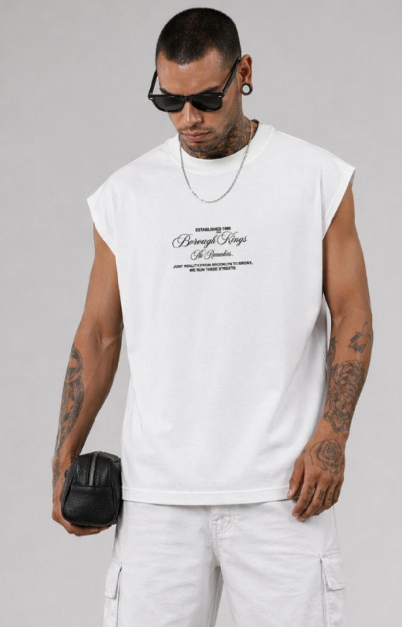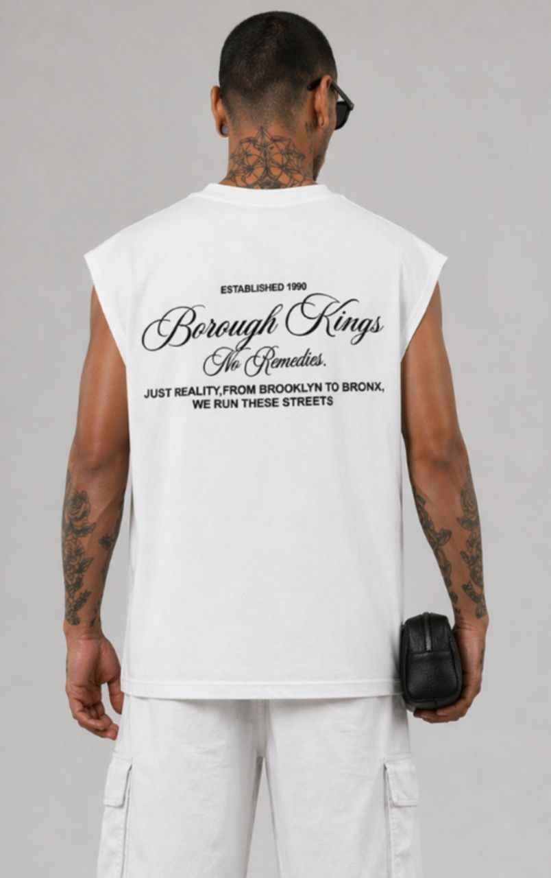 Λευκή ανδρική αμάνικη μπλούζα σε άνετη γραμμή, με statement τύπωμα “Borough Kings” στην πλάτη και urban αισθητική εμπνευσμένη από Brooklyn και Bronx.