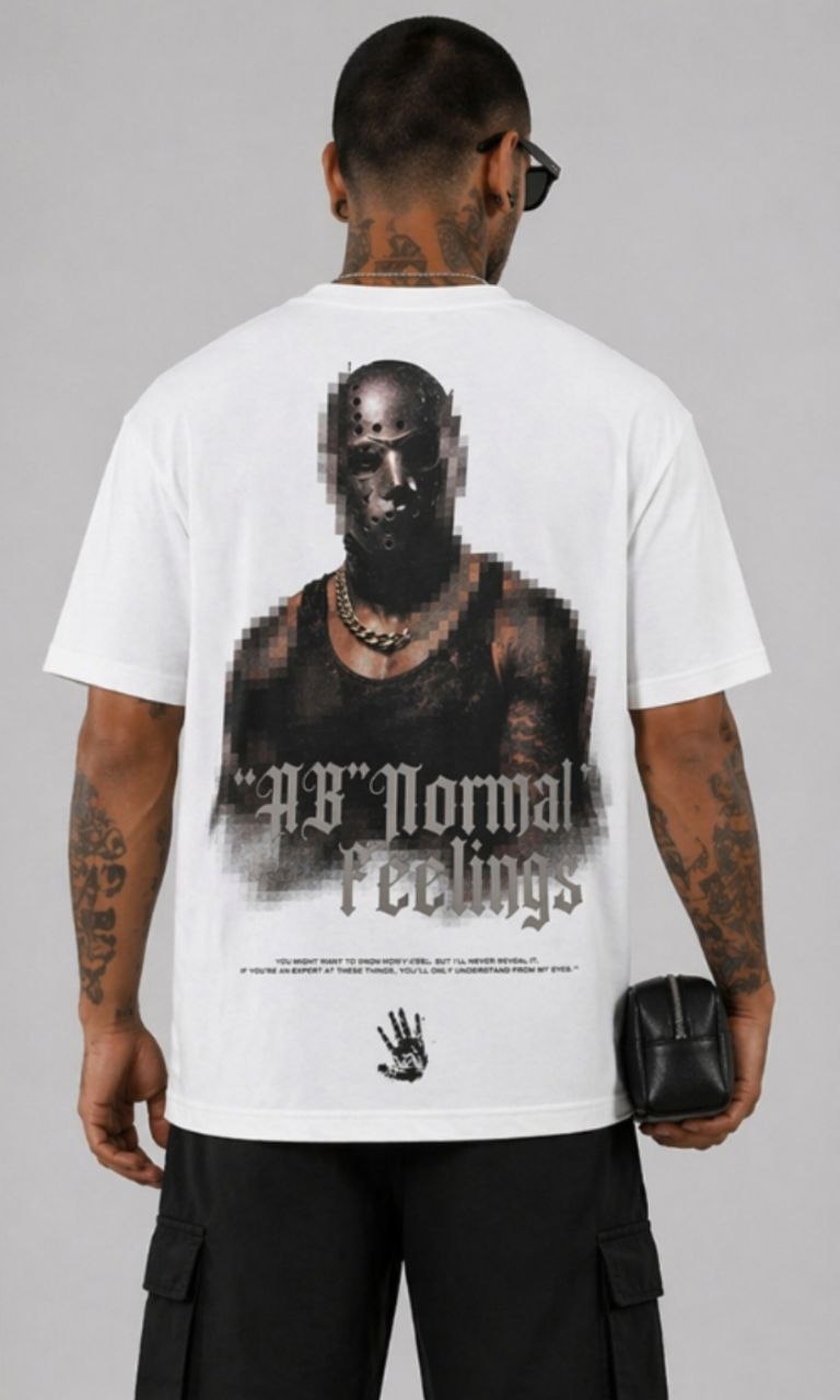 Στην πίσω πλευρά διαθέτει εντυπωσιακό τύπωμα με masked φιγούρα, pixel αισθητική και gothic lettering με τη φράση “Abnormal Feelings”. Το design δίνει έντονο statement χαρακτήρα και κάνει την μπλούζα ιδανική για όσους θέλουν ένα πιο edgy και urban αποτέλεσμα.