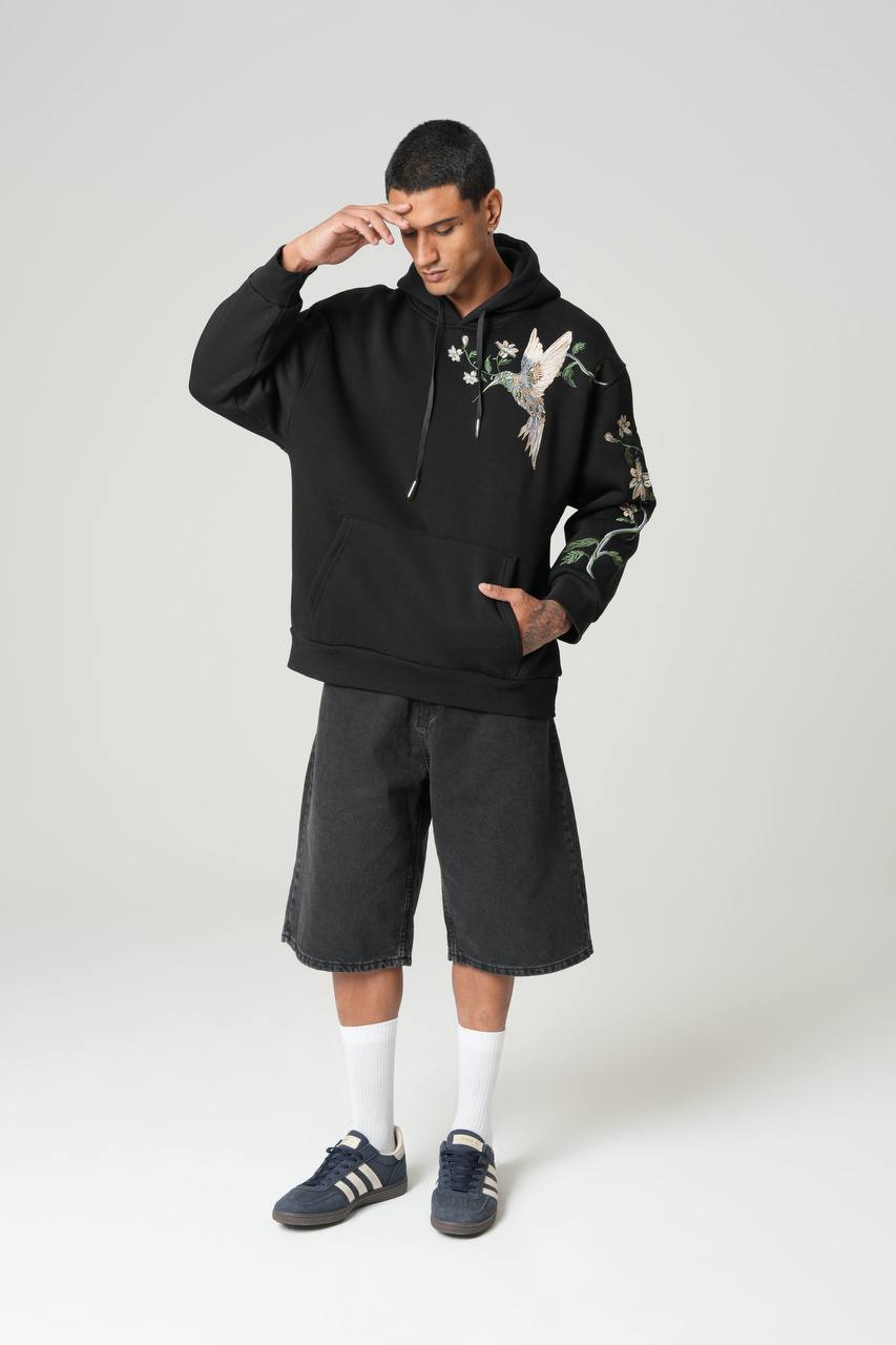 Αυτό το ανδρικό μαύρο φούτερ συνδυάζει την άνεση με την καλλιτεχνική αισθητική. Διαθέτει κουκούλα με κορδόνια και μεγάλη τσέπη καγκουρό για πρακτικότητα, ενώ το κεντητό σχέδιο με κολιμπρί και λουλούδια στο στήθος και στα μανίκια το καθιστά ξεχωριστό. Το λεπτομερές κέντημα προσθέτει premium χαρακτήρα, αναδεικνύοντας το φούτερ σε statement κομμάτι για casual αλλά και πιο προσεγμένες streetwear εμφανίσεις. Κατασκευασμένο από ποιοτικό ύφασμα που προσφέρει άνεση και ζεστασιά, είναι ιδανικό για καθημερινή χρήση και styling που ξεφεύγει από τα συνηθισμένα.