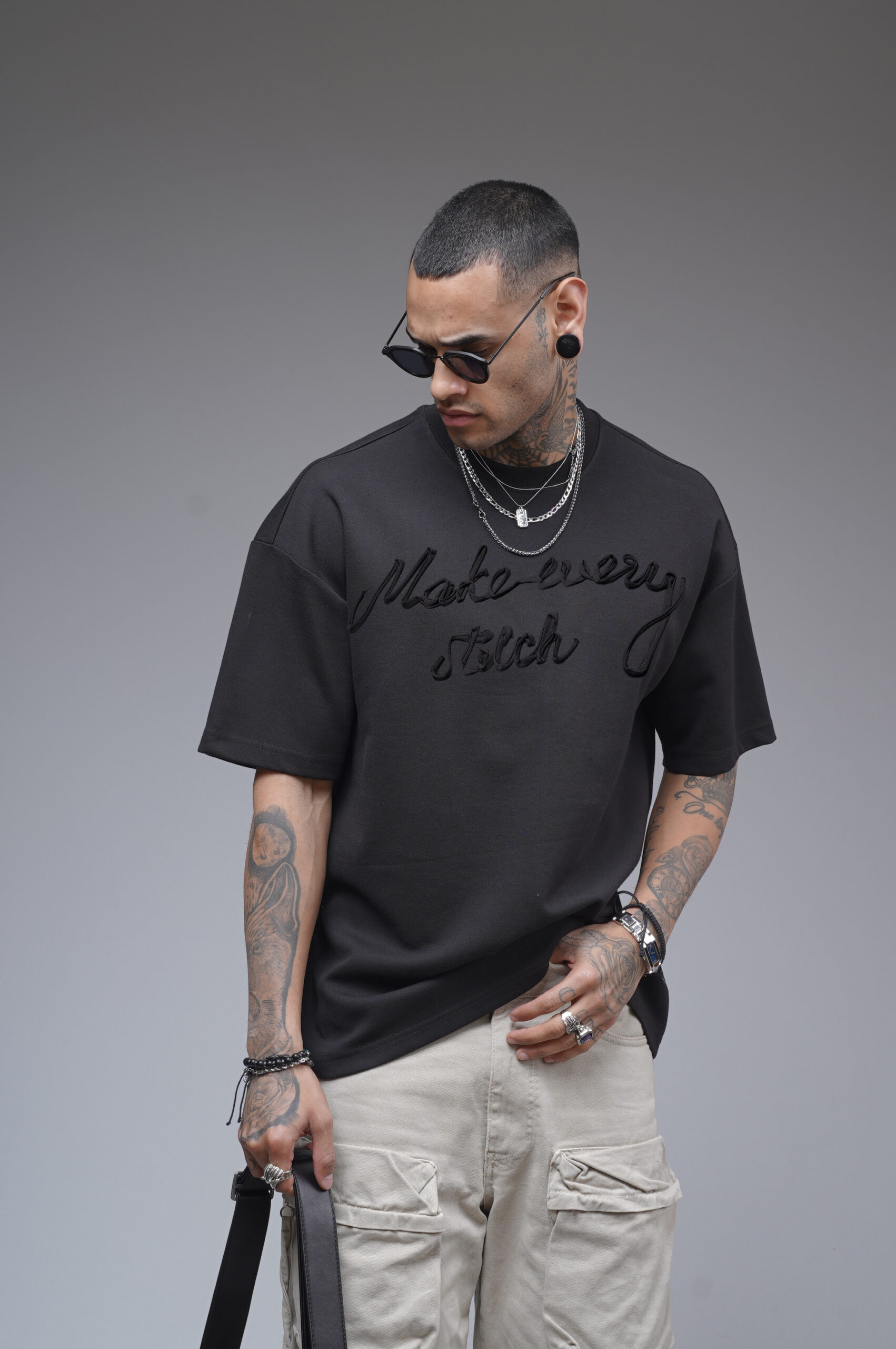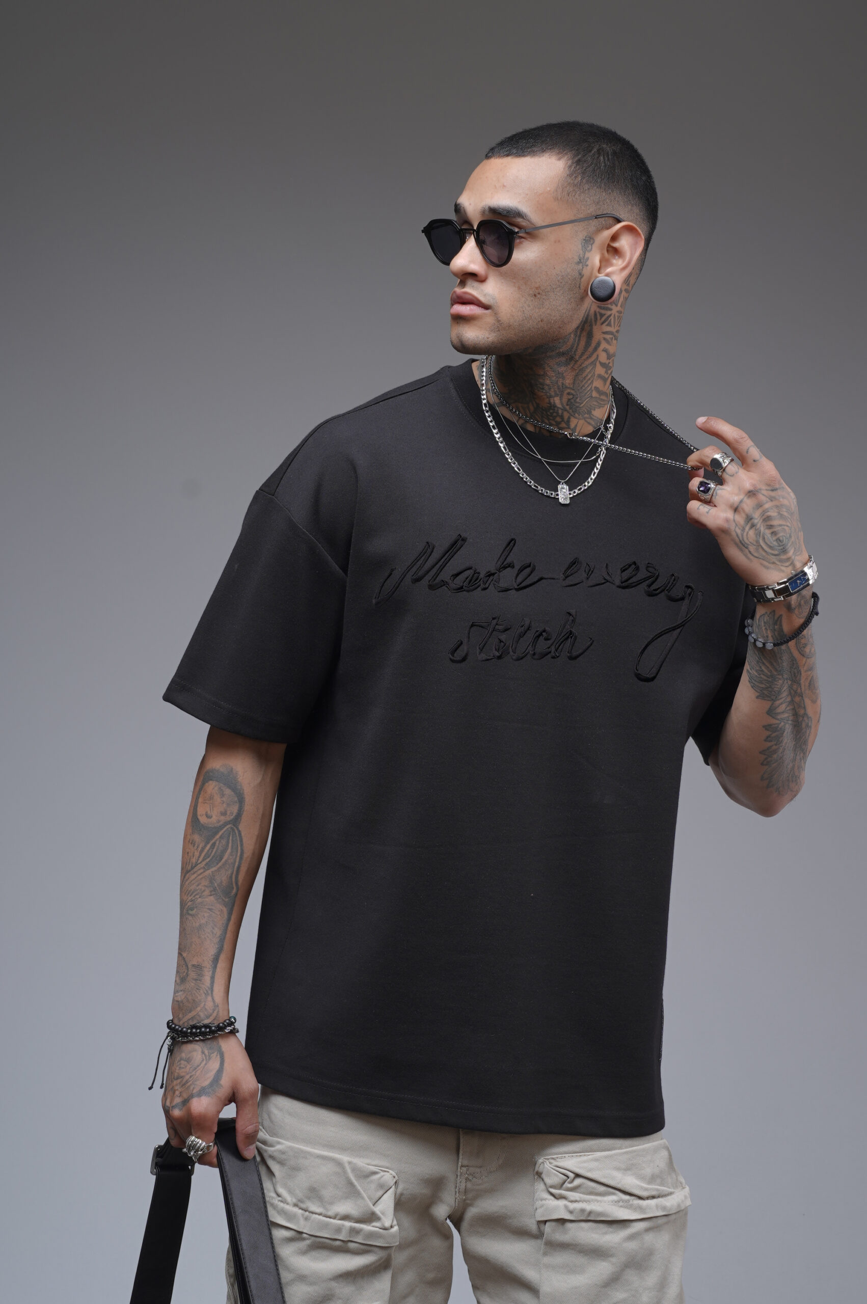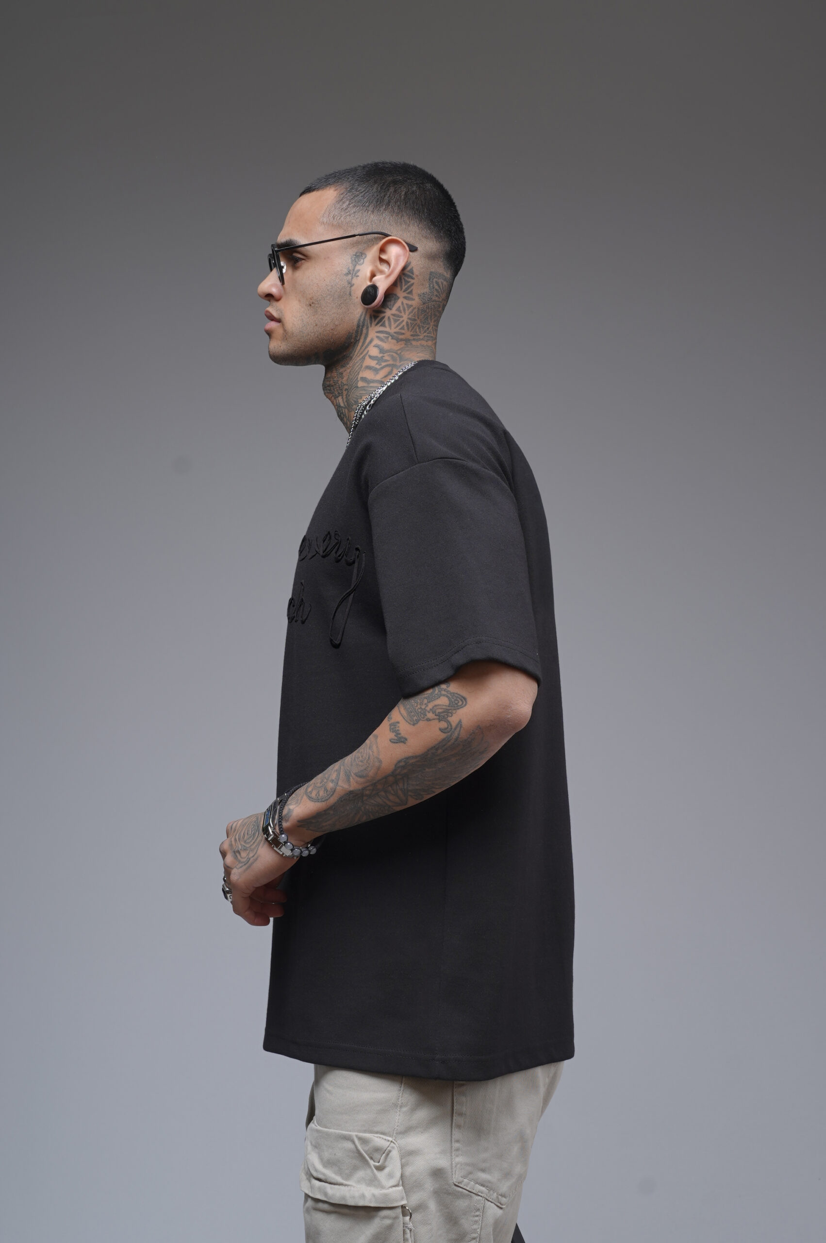 Ανδρικό oversized t-shirt σε μαύρο χρώμα με εντυπωσιακό ανάγλυφο lettering στο μπροστινό μέρος. Σύγχρονη αισθητική, άνετη εφαρμογή και urban χαρακτήρας που το καθιστούν ιδανική επιλογή για fashion-forward ανδρικές συλλογές.