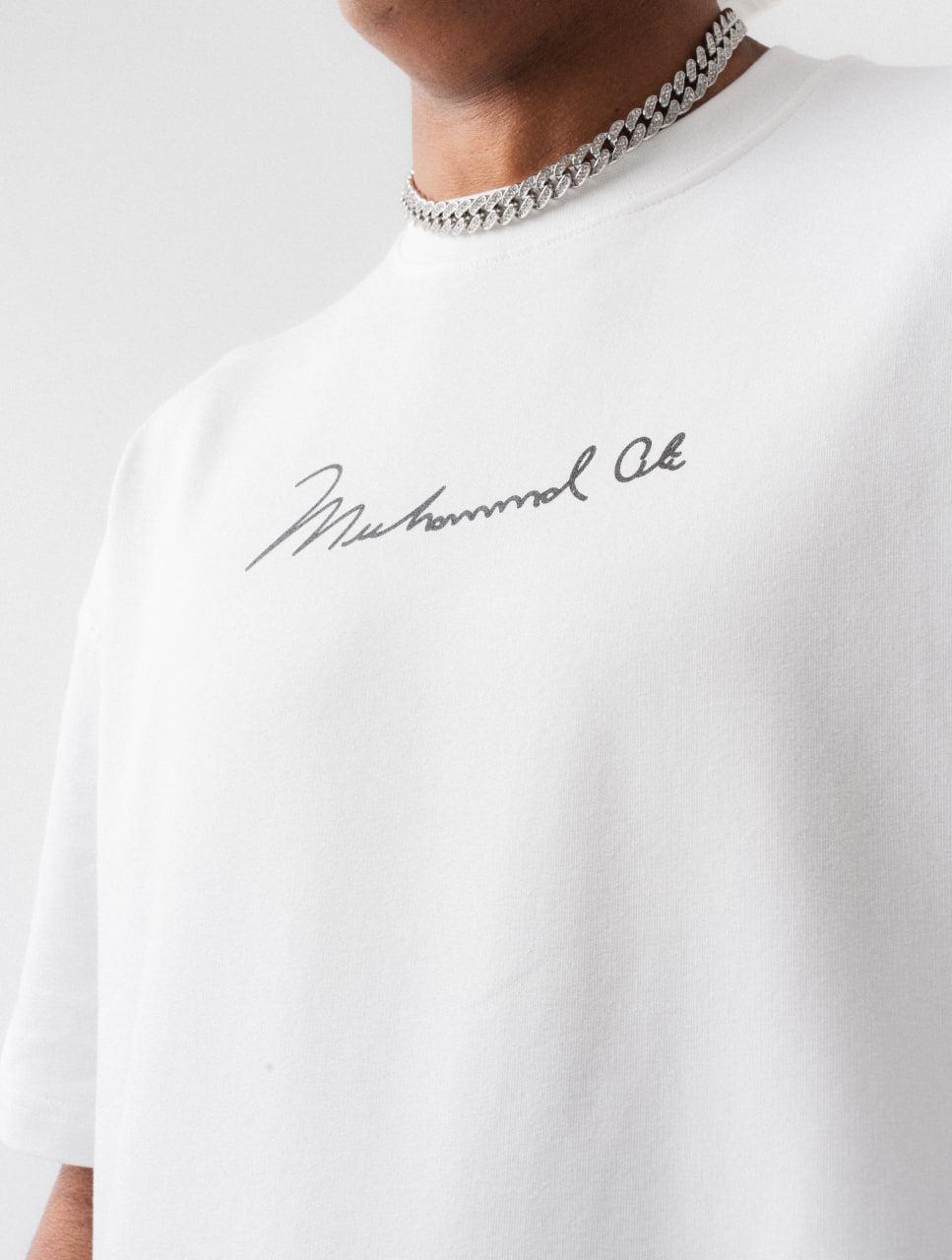 Ανδρικό oversized t-shirt σε λευκό χρώμα με εντυπωσιακό print στην πλάτη εμπνευσμένο από τον Muhammad Ali. Μοντέρνος σχεδιασμός με κοντό μανίκι και statement αισθητική, ιδανικό για casual και streetwear εμφανίσεις.