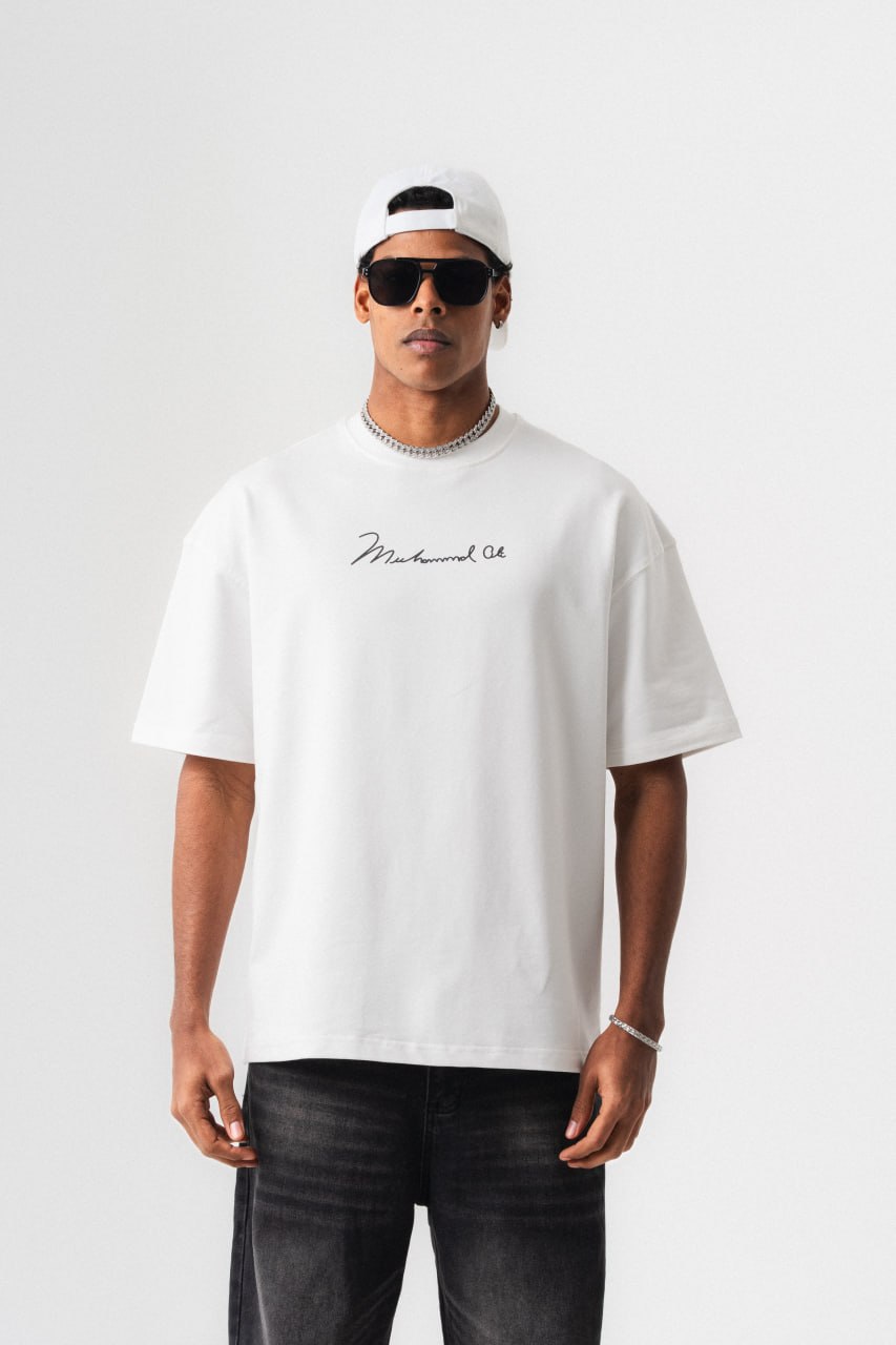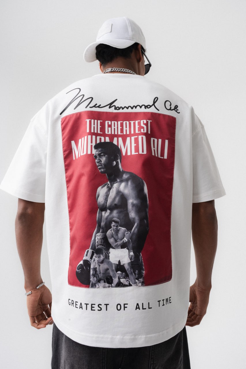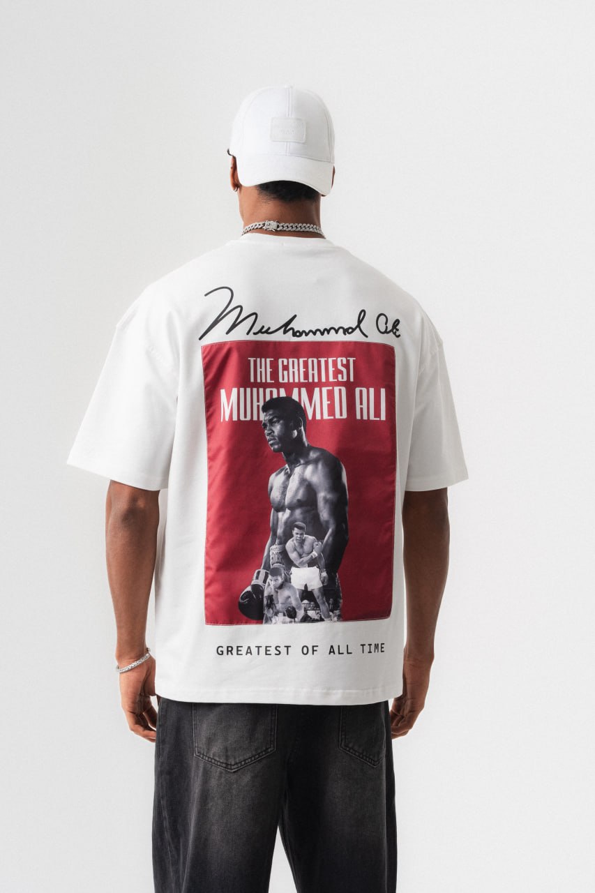 Ανδρικό t-shirt oversized γραμμής σε λευκή απόχρωση, που συνδυάζει άνεση και σύγχρονο streetwear ύφος. Στην πλάτη διαθέτει μεγάλο εντυπωσιακό print με αφιέρωση στον θρυλικό Muhammad Ali, σε κόκκινο και ασπρόμαυρο σχεδιασμό, που δημιουργεί έντονη αντίθεση και ξεχωριστό χαρακτήρα. Το επάνω μέρος ολοκληρώνεται με διακοσμητική υπογραφή, ενώ στο κάτω μέρος το slogan ενισχύει το δυναμικό ύφος του σχεδίου.