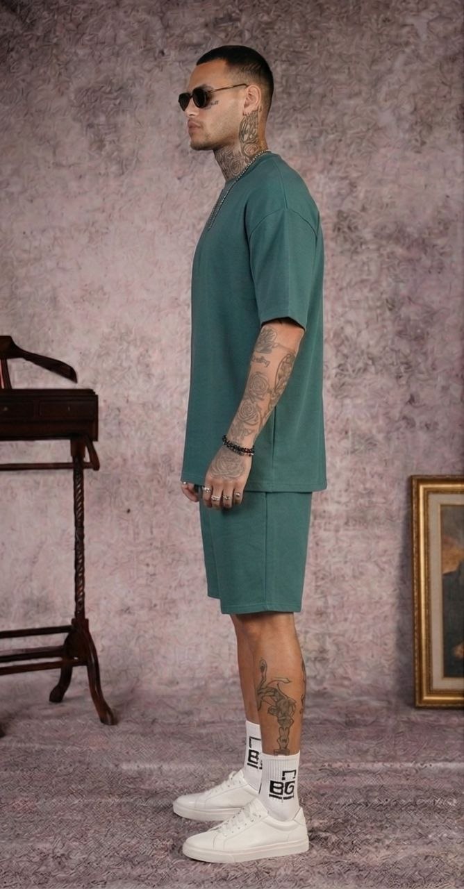 Δώσε φρεσκάδα στο στυλ σου με αυτό το ανδρικό σετ σε σύγχρονη πράσινη απόχρωση, ιδανικό για άνετες και μοντέρνες εμφανίσεις. Το σετ αποτελείται από oversized t-shirt με minimal σχεδιασμό και βερμούδα με χαλαρή γραμμή, προσφέροντας άνεση και ελευθερία κινήσεων όλη μέρα.