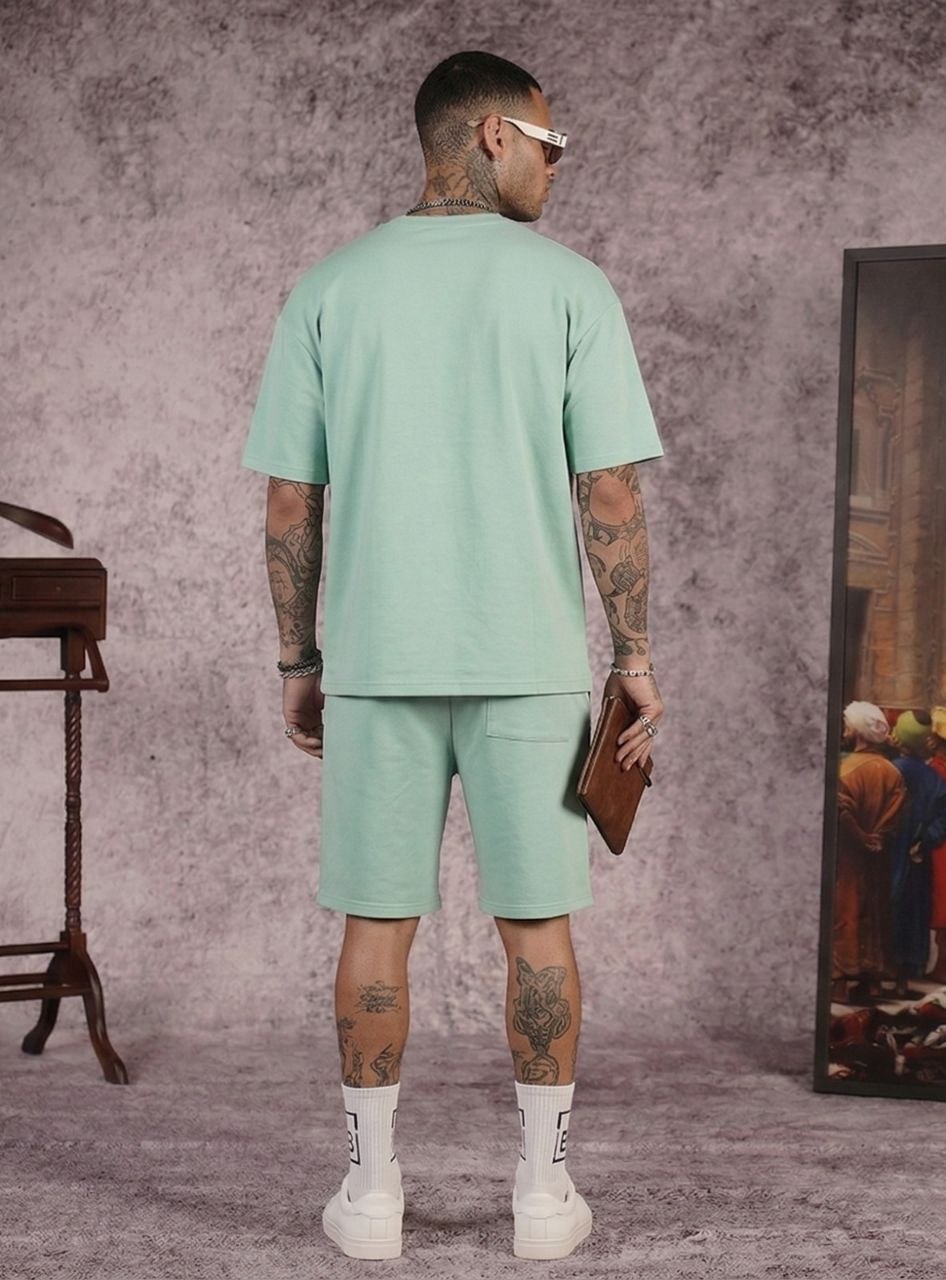 Μοντέρνο ανδρικό σετ σε mint απόχρωση που αποτελείται από oversized t-shirt και βερμούδα. Άνετο και ιδανικό για casual & streetwear εμφανίσεις.