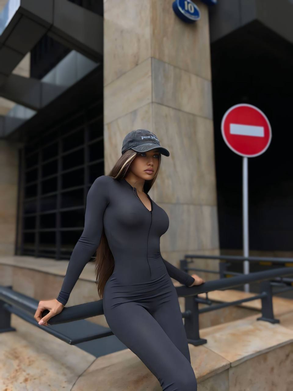 Αν ψάχνεις την απόλυτη fashion δήλωση, αυτή η ολόσωμη φόρμα είναι η ιδανική επιλογή. Σχεδιασμένη σε total black, εφαρμόζει άψογα στο σώμα, δημιουργώντας εφέ second skin που αναδεικνύει κάθε καμπύλη με έναν καθαρό, μοντέρνο τρόπο. Το βαθύ V ντεκολτέ προσθέτει αισθησιασμό, ενώ τα μακριά μανίκια ισορροπούν το σύνολο χαρίζοντας μια κομψή, sleek σιλουέτα.