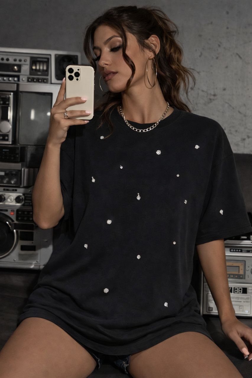 Η γυναικεία oversized μπλούζα με διακοσμητικά strass αποτελεί μια μοντέρνα επιλογή που συνδυάζει casual άνεση με κομψές λεπτομέρειες. Η μαύρη απόχρωση προσφέρει διαχρονικό χαρακτήρα, ενώ τα μικρά λαμπερά strass που είναι διακριτικά τοποθετημένα σε όλη την μπλούζα δημιουργούν ένα ιδιαίτερο και φωτεινό αποτέλεσμα.