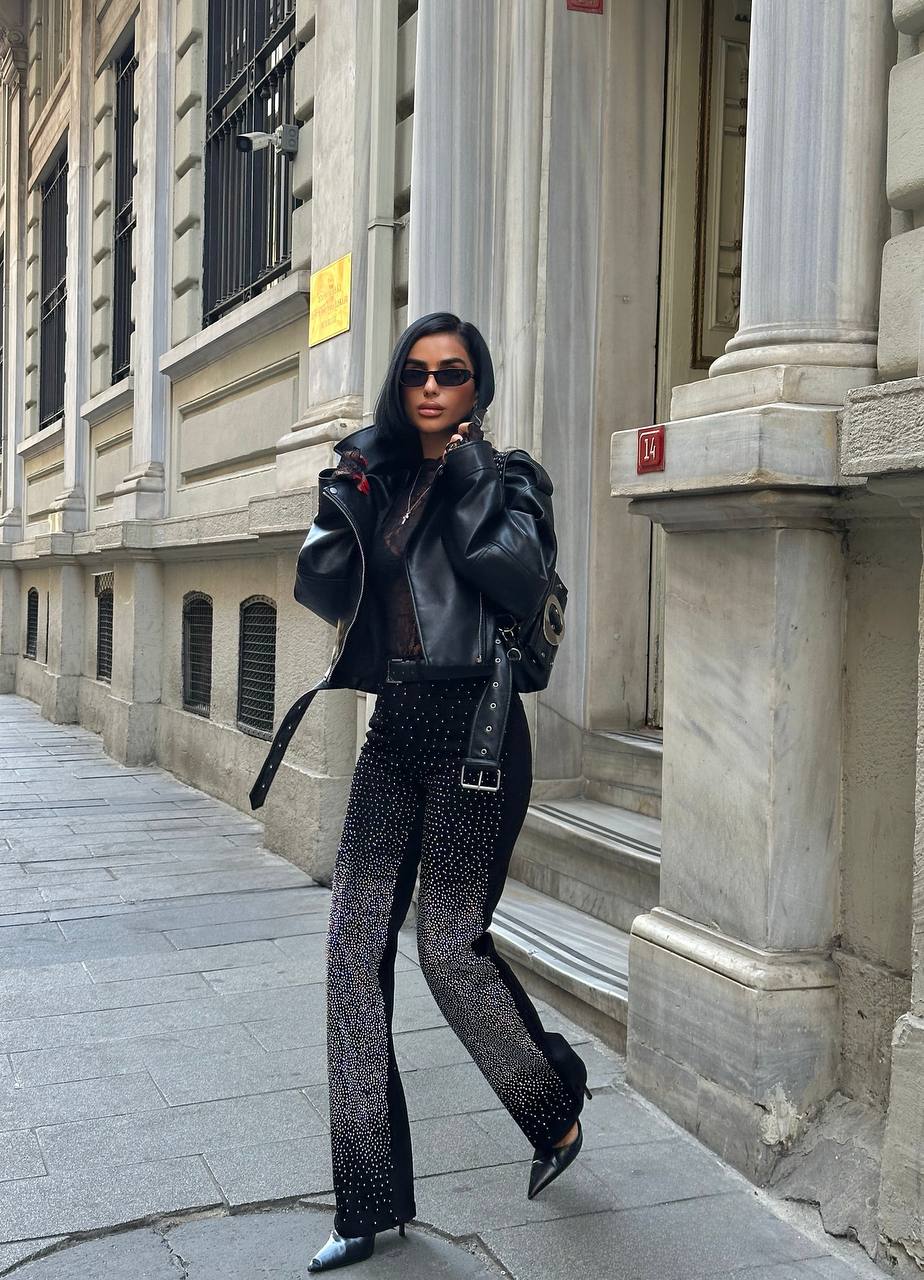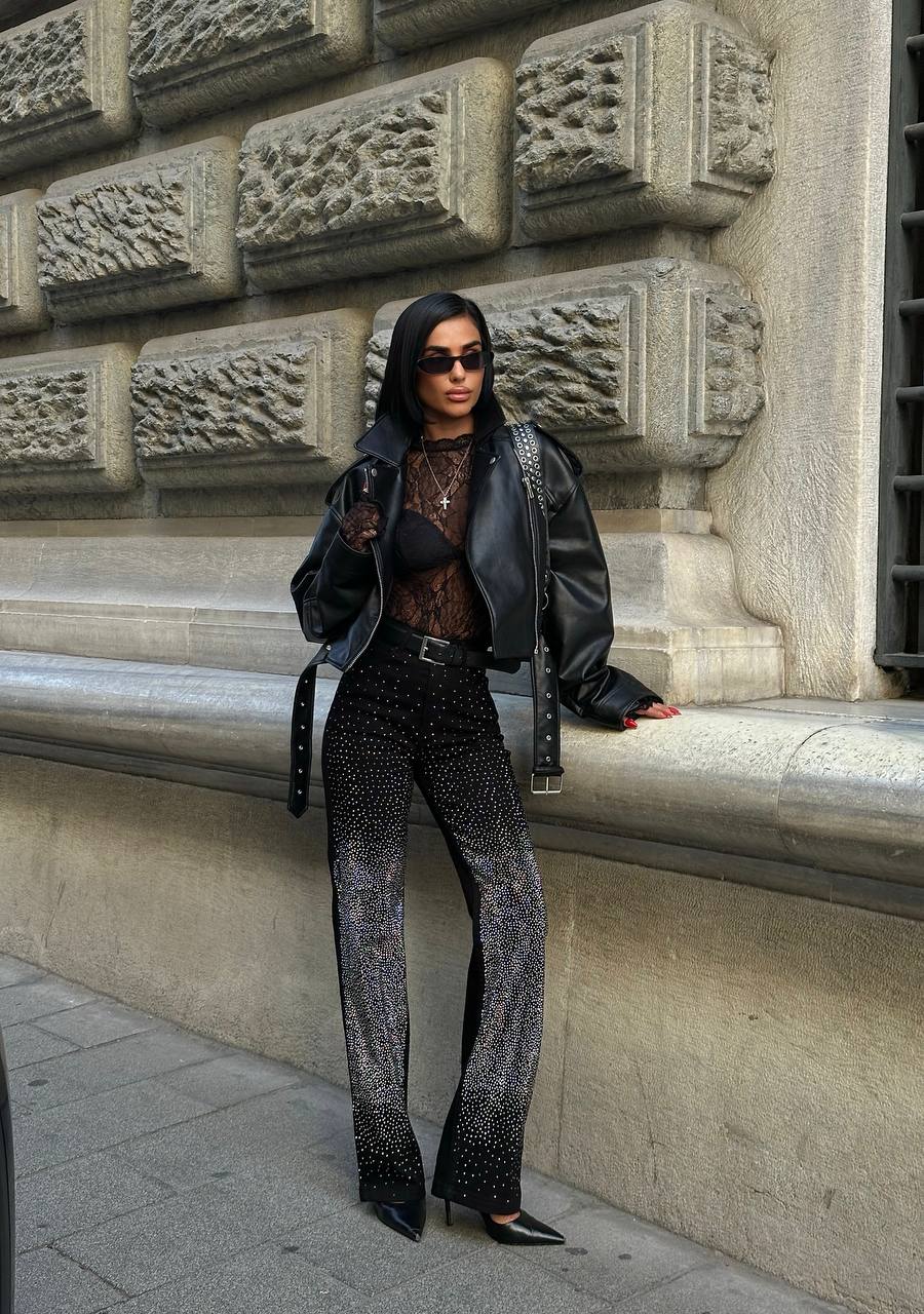 Εντυπωσιακό μαύρο ψηλόμεσο τζιν με ίσια γραμμή και κέντημα από λαμπερά στρας σε ombre εφέ, για glam βραδινές εμφανίσεις που κλέβουν τα βλέμματα.
