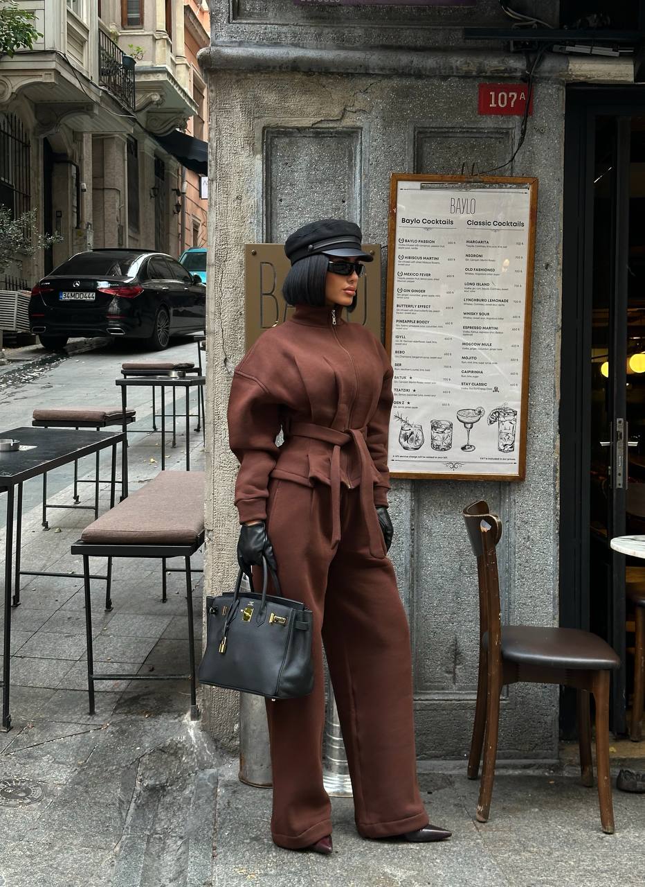 Το σετ Belted Chic επαναφέρει τη φόρμα στην πιο κομψή της εκδοχή. Η ζακέτα–φούτερ διαθέτει ψηλό λαιμό με φερμουάρ, dropped ώμους και ενσωματωμένη ζώνη από το ίδιο ύφασμα που δένει στη μέση, δημιουργώντας θηλυκή σιλουέτα τύπου peplum. Το βαθύ σοκολατί χρώμα συνδυάζεται εύκολα με μαύρα αξεσουάρ, ενώ το μαλακό, ζεστό ύφασμα προσφέρει άνεση ακόμη και στις πιο κρύες μέρες.