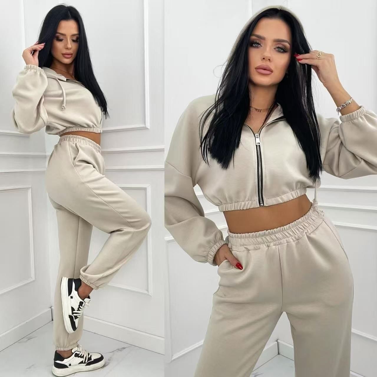 Μοντέρνο και άνετο σετ φόρμας σε μπεζ απόχρωση, που αποτελείται από cropped ζακέτα με φερμουάρ και παντελόνι jogger με λάστιχο στη μέση. Ιδανικό για casual εμφανίσεις με στυλ όλη μέρα.