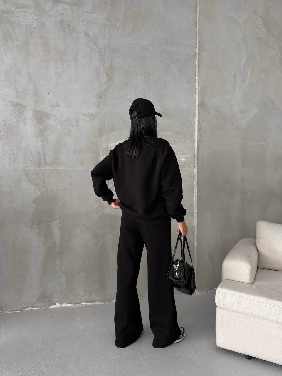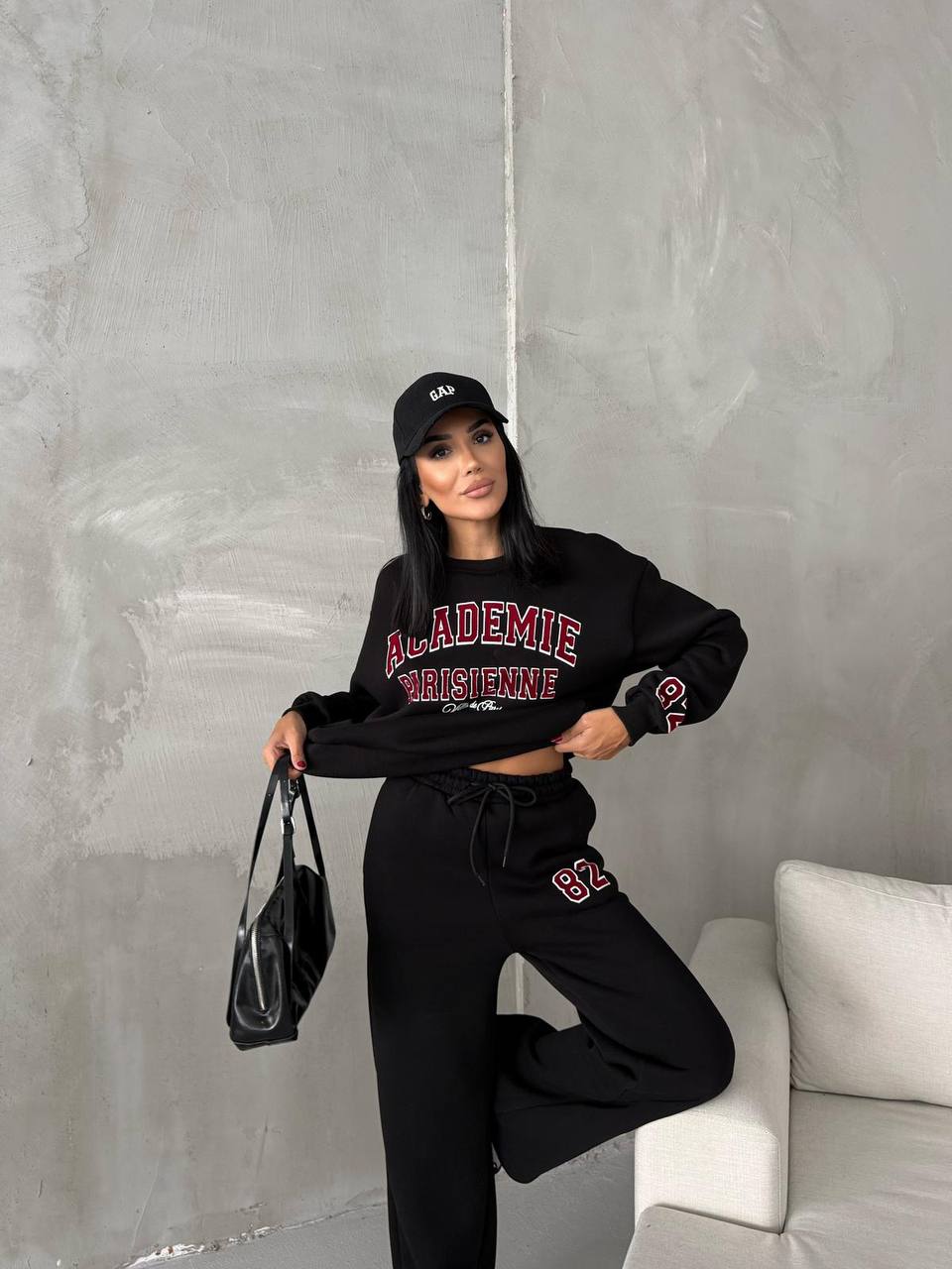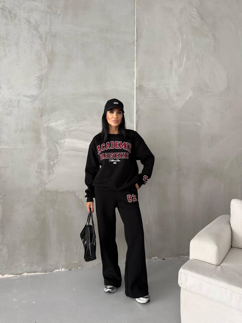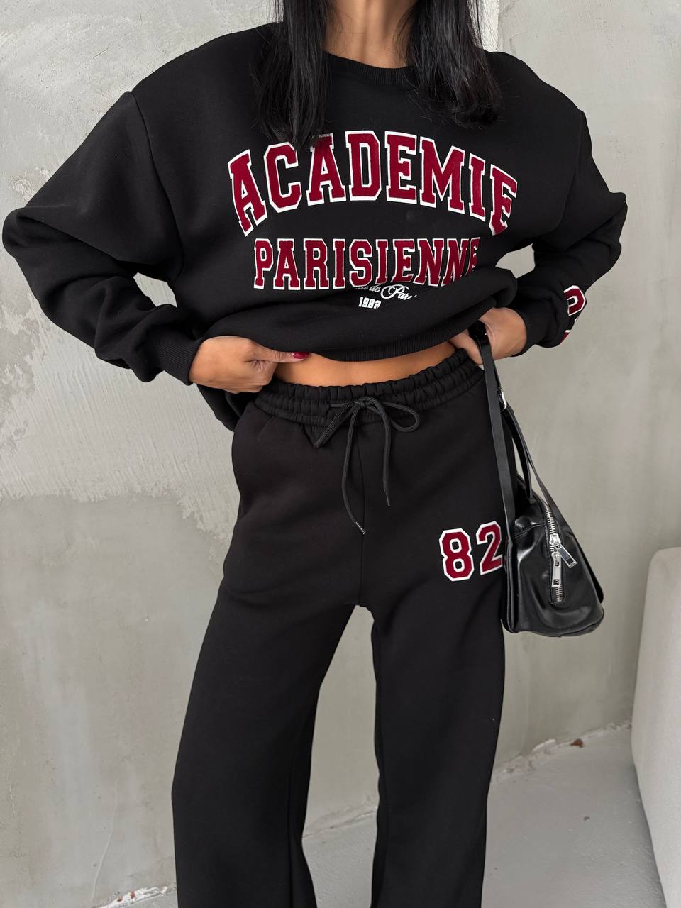 Μαύρο γυναικείο σετ φόρμας με oversized φούτερ “Academie Parisienne” και παντελόνι με τύπωμα 82, σε άνετη ίσια γραμμή για καθημερινό sporty–college look.